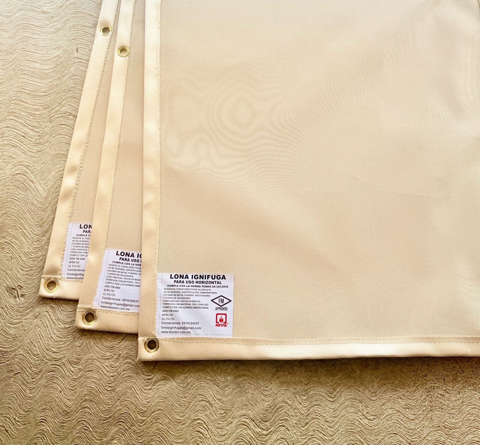 Lona Ignifuga de 3x3 metros - Venta a nivel nacional - Envios a todo Mexico. Lona Ignifuga grado 1 para uso vertical, fabricada con tela de fibra de vidrio con cunierta de neopreno, resiste altas temperaturas y chispa de soldadura. Lona Ignifuga Certificada cumple con la norama ANSI FM 4950 - norma NFPA 701 - norma UL 214, 723 - norma PEMEX NRF-293-PEMEX-2012.