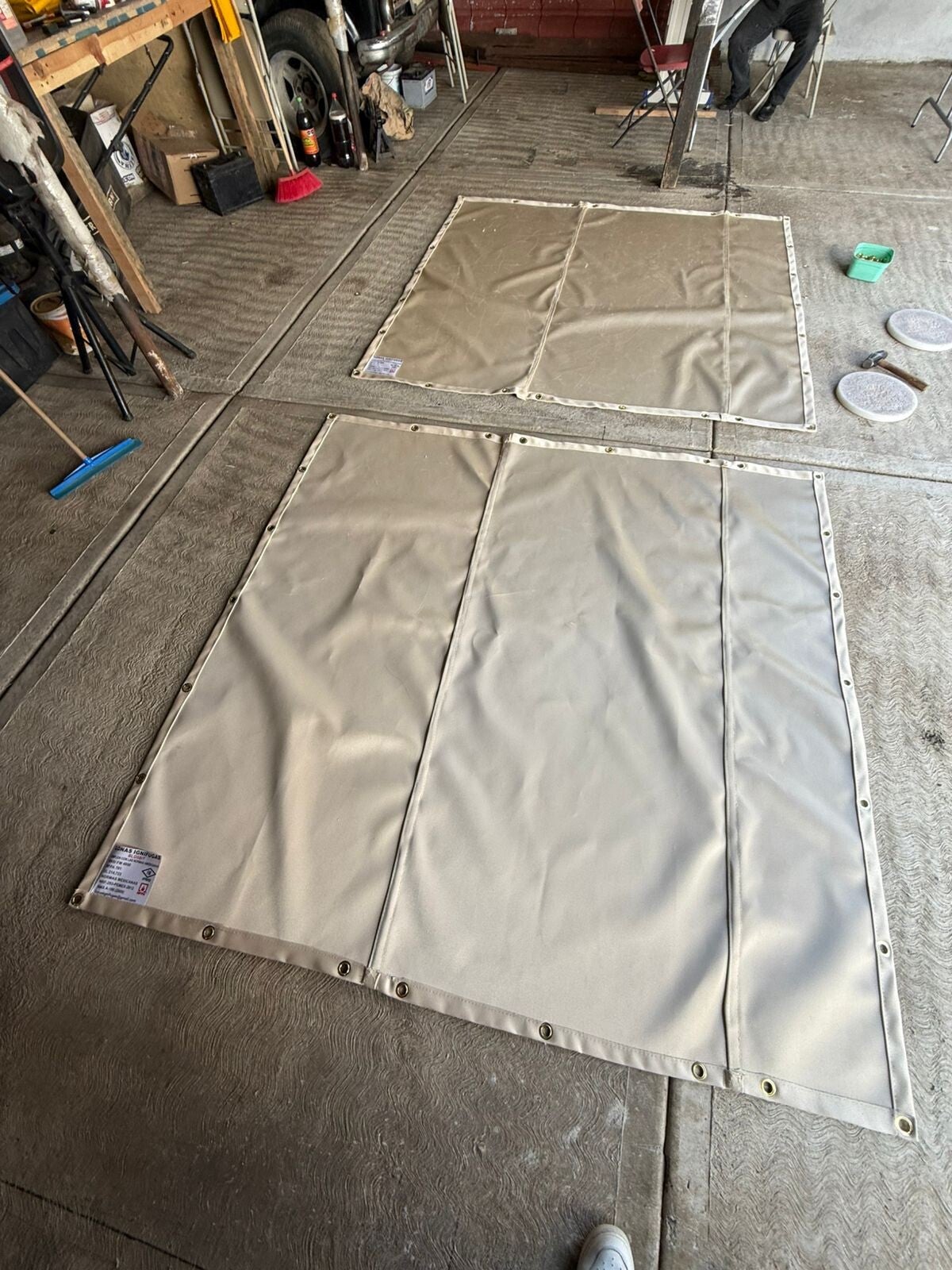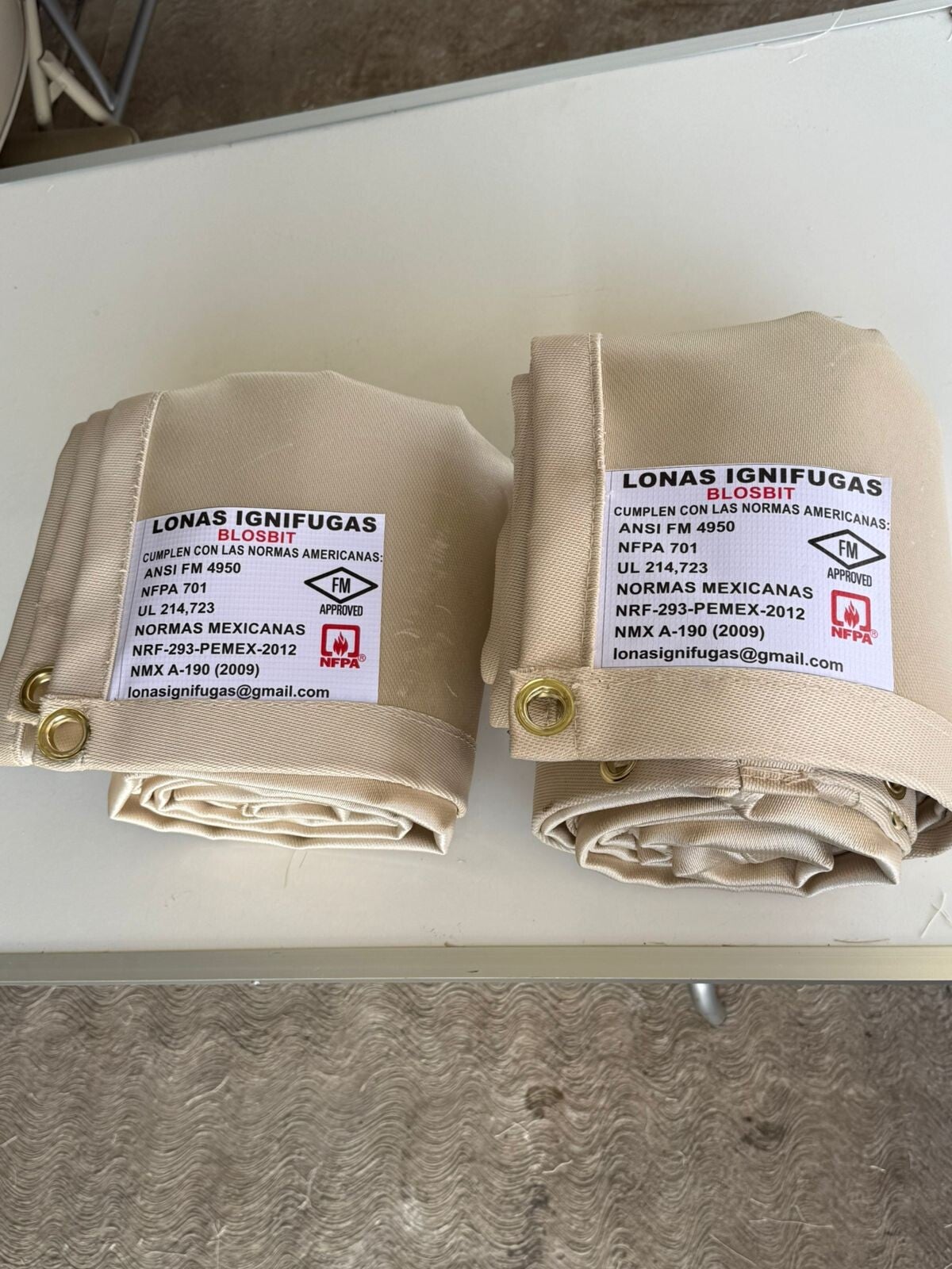 Lona Ignifuga de 4x4 metros - Venta a nivel nacional - Envios a todo Mexico. Lona Ignifuga grado 1 para uso vertical, fabricada con tela de fibra de vidrio con cunierta de neopreno, resiste altas temperaturas y chispa de soldadura. Lona Ignifuga Certificada cumple con la norama ANSI FM 4950 - norma NFPA 701 - norma UL 214, 723 - norma PEMEX NRF-293-PEMEX-2012.